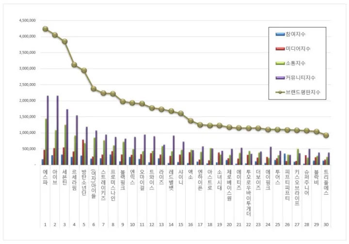 The Korean Business Research Institute วิเคราะห์ฐานข้อมูลของไอดอลกรุป ทั้งบอยกรุปและเกิร์ลกรุป K-POP การจัดอันดับชื่อเสียงของแบรนด์โดยการประเมินทั้งเชิงบวกและเชิงลบ ซึ่งรวบรวมจากการมีส่วนร่วมของผู้บริโภคจากช่องทางต่างๆ ในเกาหลี การนำเสนอของสื่อ การสื่อสารและการเข้าถึงบนสังคมออนไลน์