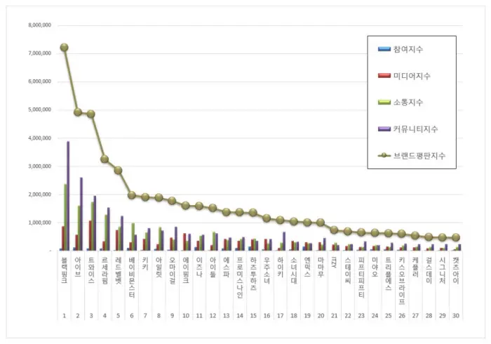 ด้วยดัชนีคะแนนรวมทั้งหมด 7,212,497 จุด และคียเวิร์ดที่ถูกพูดถึงร่วมกับชื่อของวง BLACKPINK มากที่สุดในเดือนนี้ ได้แก่ ‘Grammy‘, ‘เวิลด์ทัวร์’ และ ‘POP-UP STORE’