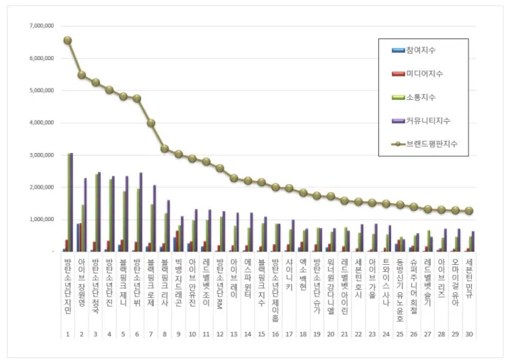 The Korean Business Research Institute วิเคราะห์ฐานข้อมูลของสมาชิกวงไอดอลกรุป K-POP ทั้งสมาชิกวงเกิร์ลกรุป และสมาชิกวงบอยกรุป โดยจัดอันดับชื่อเสียงของแบรนด์โดยการประเมินทั้งเชิงบวกและเชิงลบ ซึ่งรวบรวมจากการมีส่วนร่วมของผู้บริโภคจากช่องทางต่างๆ ในเกาหลี การนำเสนอของสื่อ การสื่อสารและการเข้าถึงบนสังคมออนไลน์