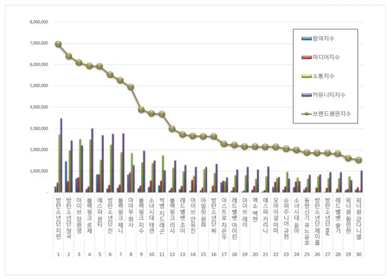 The Korean Business Research Institute วิเคราะห์ฐานข้อมูลของสมาชิกวงไอดอลกรุป K-POP ทั้งสมาชิกวงเกิร์ลกรุป และสมาชิกวงบอยกรุป โดยจัดอันดับชื่อเสียงของแบรนด์โดยการประเมินทั้งเชิงบวกและเชิงลบ ซึ่งรวบรวมจากการมีส่วนร่วมของผู้บริโภคจากช่องทางต่างๆ ในเกาหลี การนำเสนอของสื่อ การสื่อสารและการเข้าถึงบนสังคมออนไลน์