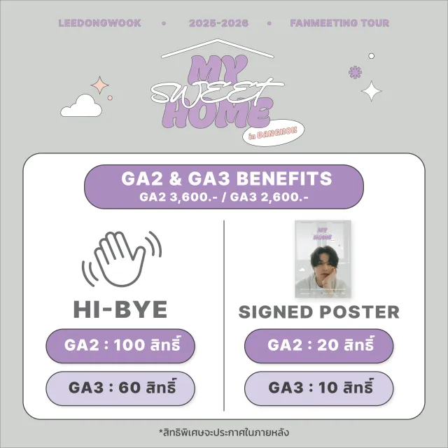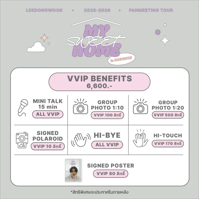 แฟนมีตติ้งครั้งนี้มาพร้อมแพ็กเกจสิทธิพิเศษแน่นครบ ทั้ง Mini Talk, Hi-Bye, Hi-Touch, Group Photo, Signed Polaroid, Signed Poster, Photo Card และ Official Poster เพิ่มโอกาสใกล้ชิดศิลปินแทบทุกที่นั่ง