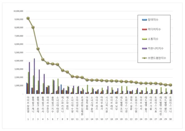 ด้วยดัชนีคะแนนรวมทั้งหมด 9,160,195 จุด และคีย์เวิร์ดที่ถูกพูดถึงร่วมกับชื่อของ จางวอนยอง IVE มากที่สุดในเดือนนี้ ได้แก่ ‘BLACKHOLE’, ‘8’ และ ‘ความคิดแบบวอนยอง‘ (원영적 사고)